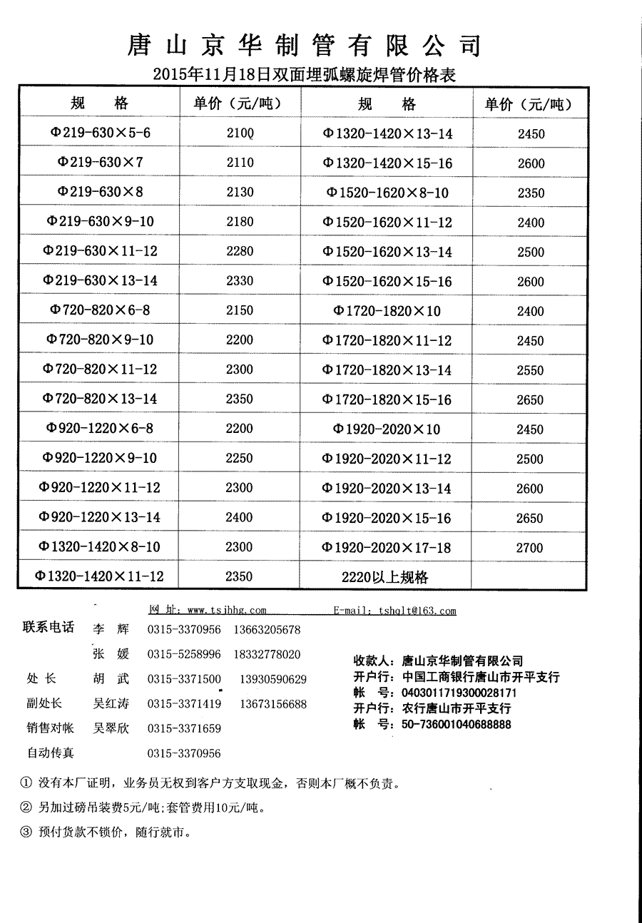 唐山京华2015年5月21日焊管价格表(长度为5.95、6米最低出厂限价、检斤价)